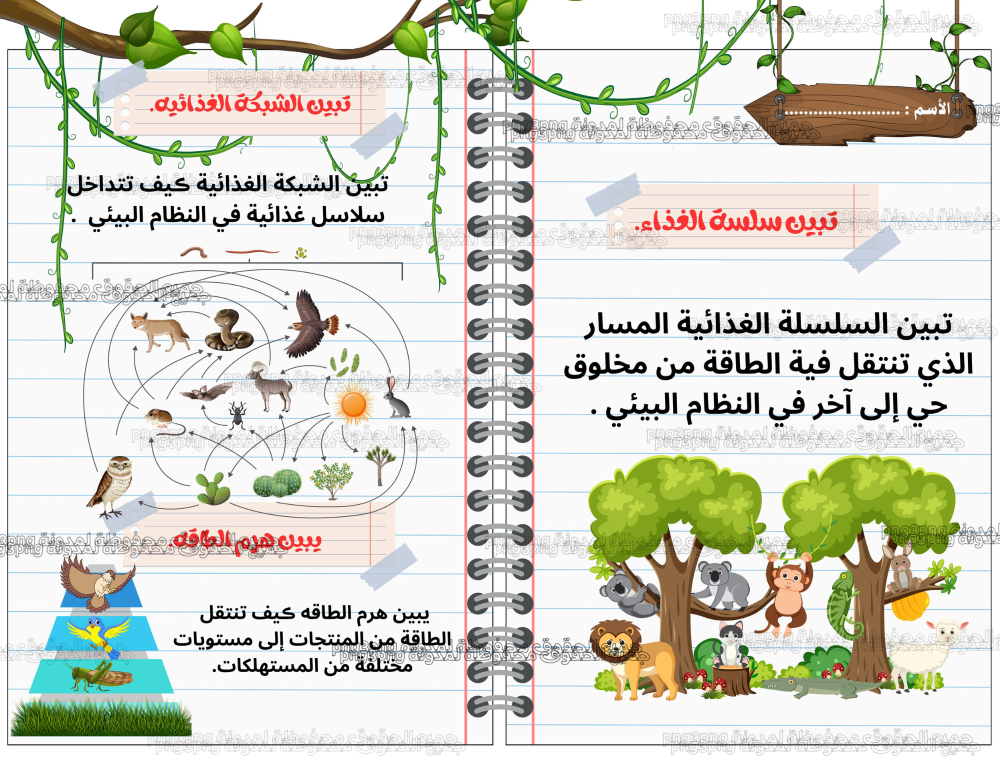 اعمل المطوية كالمبينة في الشكل ، ألخص فيها ما تعلمت عن السلاسل والشبكات الغذائية وهرم الطاقة وأعطى أمثلة على ذلك.